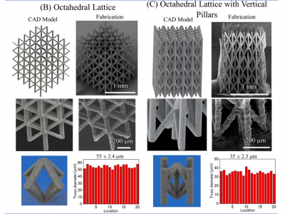 利用 Aerosol Jet 3D 納米顆粒成型技術(shù),制造新型高度復(fù)雜的3D 金屬微晶格材料,其具有: 直徑30–60μm,單位尺寸100 – 400μm 的近固態(tài)桁架構(gòu)件;設(shè)計(jì)了 3 種密度為大塊金屬 5% 至 26% 的晶格結(jié)構(gòu),以在壓縮載荷下通過彎曲和屈曲為主的機(jī)制變形